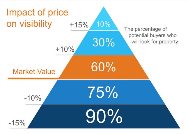 Many sellers say that they want to price their home high in order to have “negotiation room.” But what this actually does is lower the number of potential buyers who see the house. And we know that limiting demand like this will negatively impact the sales price of the house. Not sure about this? Think of it this way: when a buyer is looking for a home online (as they are doing more and more often), they put in their desired price range. If your seller is looking to sell their house for $400,000, but lists it at $425,000 to build in “negotiation room,” any potential buyers that search in the $350k-$400k range won’t even know your listing is available, let alone come see it! One great way to see this is with the chart below. The higher you price your home over its market value, the fewer potential buyers will actually see your home when searching.